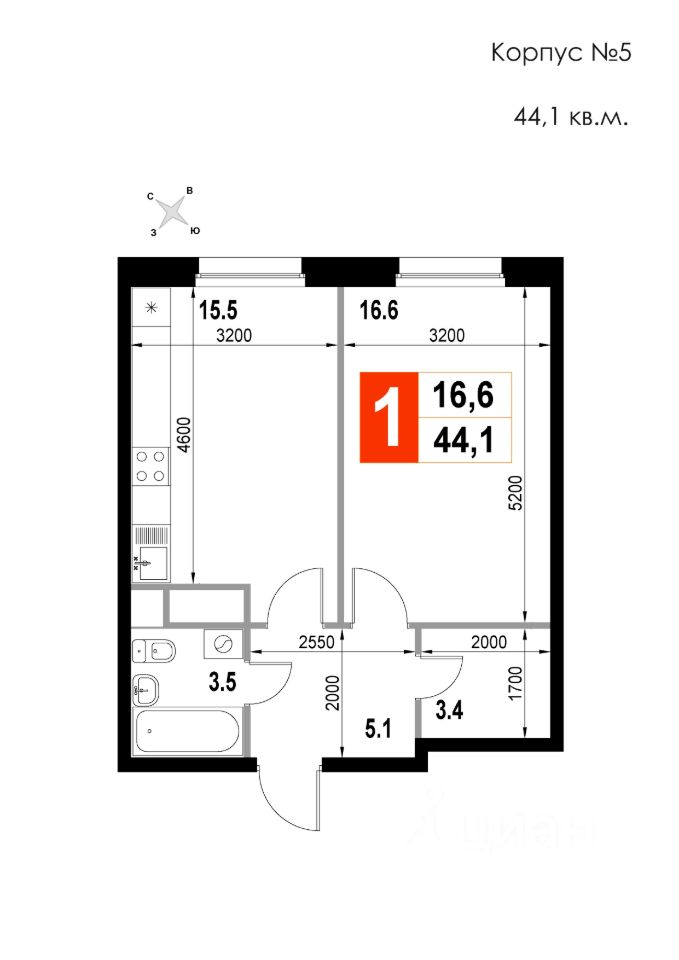 Продаётся 1-комнатная квартира в строящемся доме (Корпус 5), срок сдачи: II-кв. 2026, общей площадью 44.1 кв.м., на 17 этаже. Многоквартирный жилой дом со встроенно-пристроенными нежилыми помещениями и автостоянкой