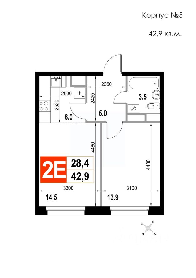 2-комн. от 42,9 м²