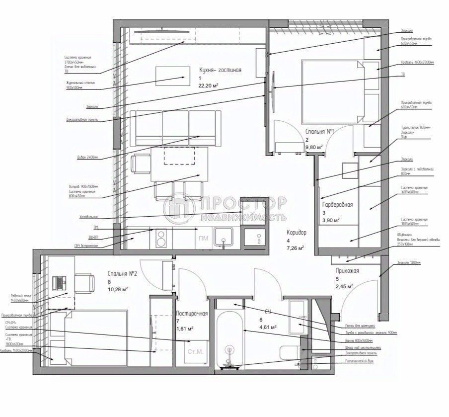 Очень функциональная планировка, где все продумано до мелочей: кухня-гостиная - 22 кв.м., мастер-спальня с собственной гардеробной, в которой установлена вентиляция, детская комната (нейтральная - подойдет, и для девочки, и для мальчика), ванная комната, отдельная зона постирочной.