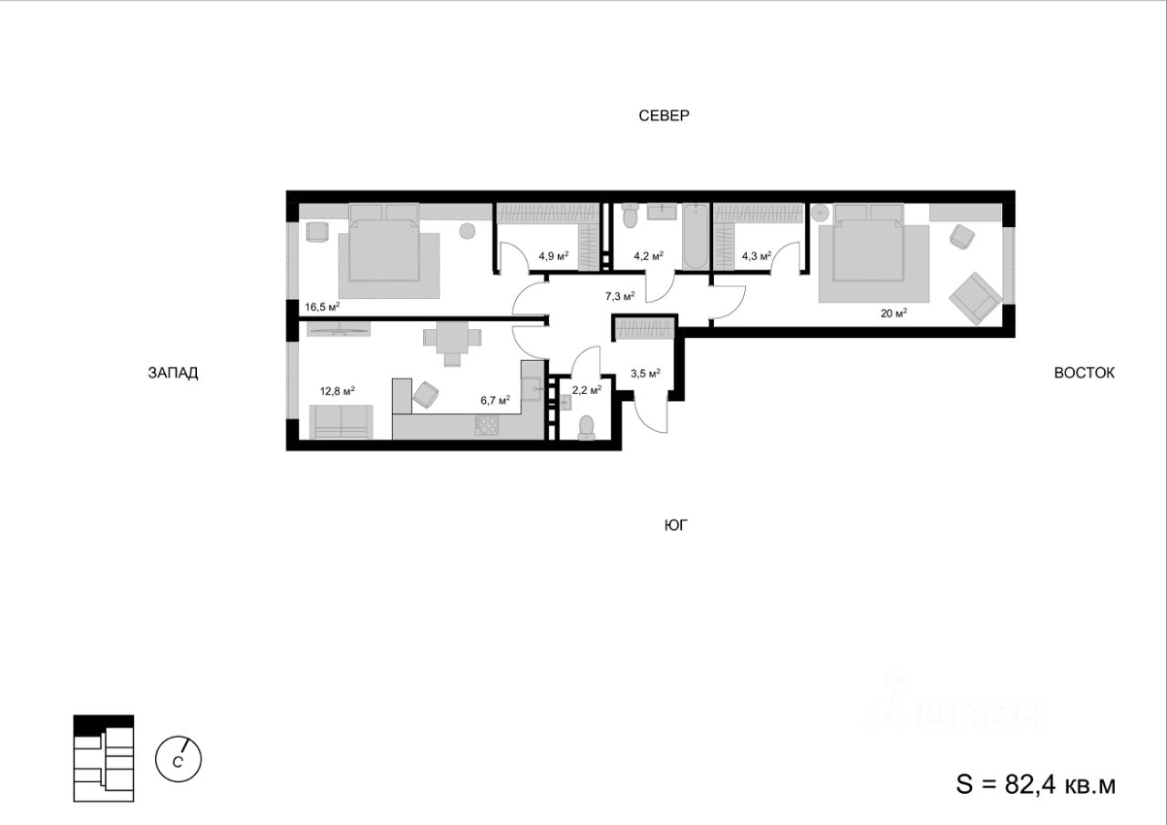 Продаётся 3-комнатная квартира в строящемся доме (Корпус 1), срок сдачи: I-кв. 2026, общей площадью 82.4 кв.м., на 17 этаже. Многоквартирный жилой дом со встроенно-пристроенными нежилыми помещениями и автостоянкой