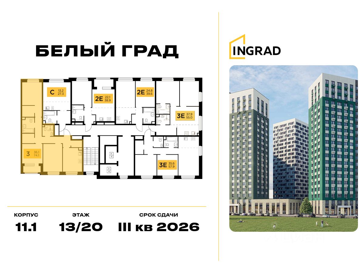 Прямая продажа от девелопера. В жилом квартале комфорт-класса "Белый Град" (девелопер ingrad) продаётся 3-спальная квартира площадью 77.20 кв.м без отделки. Квартира расположена на 13 этаже 20-этажного дома, корпус 11.1.