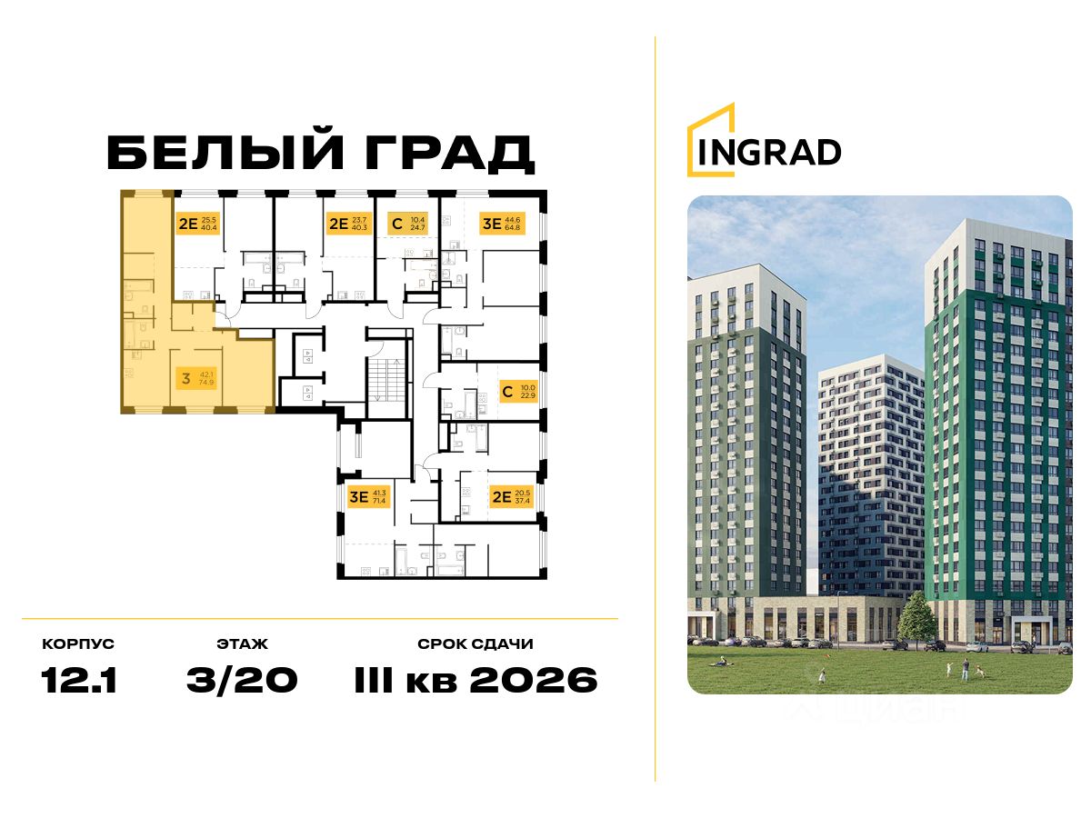 Прямая продажа от девелопера. В жилом квартале комфорт-класса "Белый Град" (девелопер ingrad) продаётся 3-спальная квартира площадью 75.30 кв.м без отделки. Квартира расположена на 7 этаже 20-этажного дома, корпус 12.1.