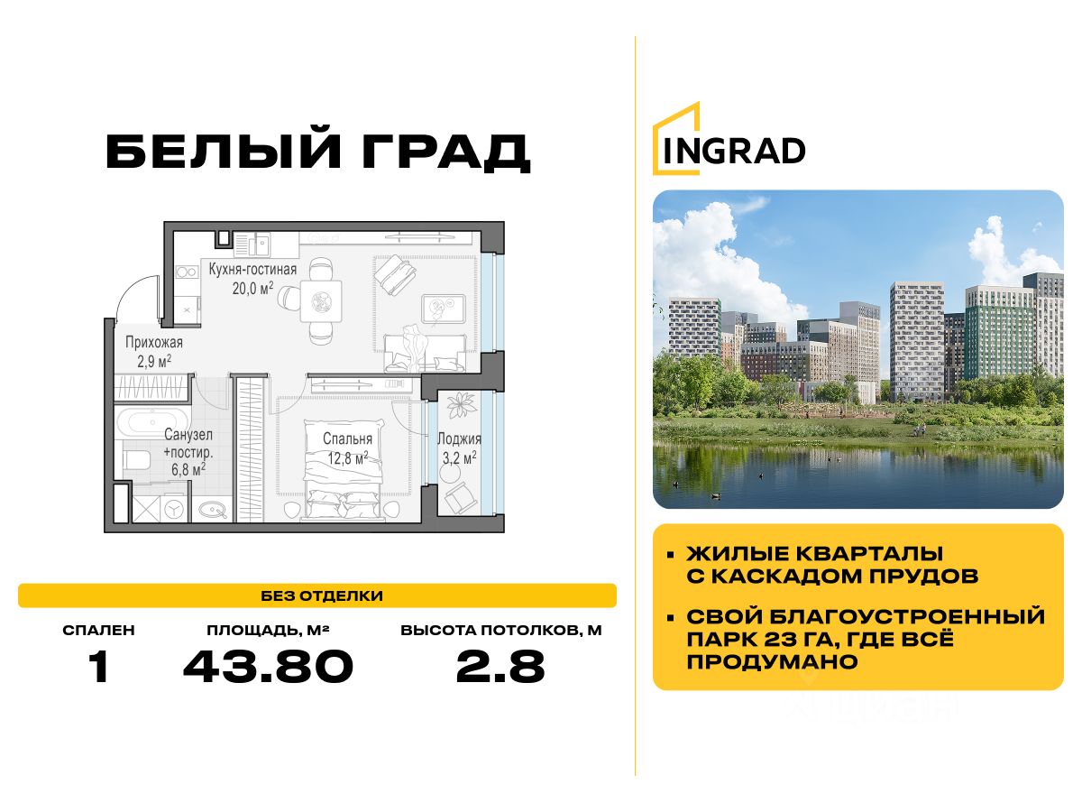 Прямая продажа от девелопера. В жилом квартале комфорт-класса "Белый Град" (девелопер ingrad) продаётся 1-спальная квартира площадью 43.80 кв.м без отделки. Квартира расположена на 9 этаже 23-этажного дома, корпус 11.2.