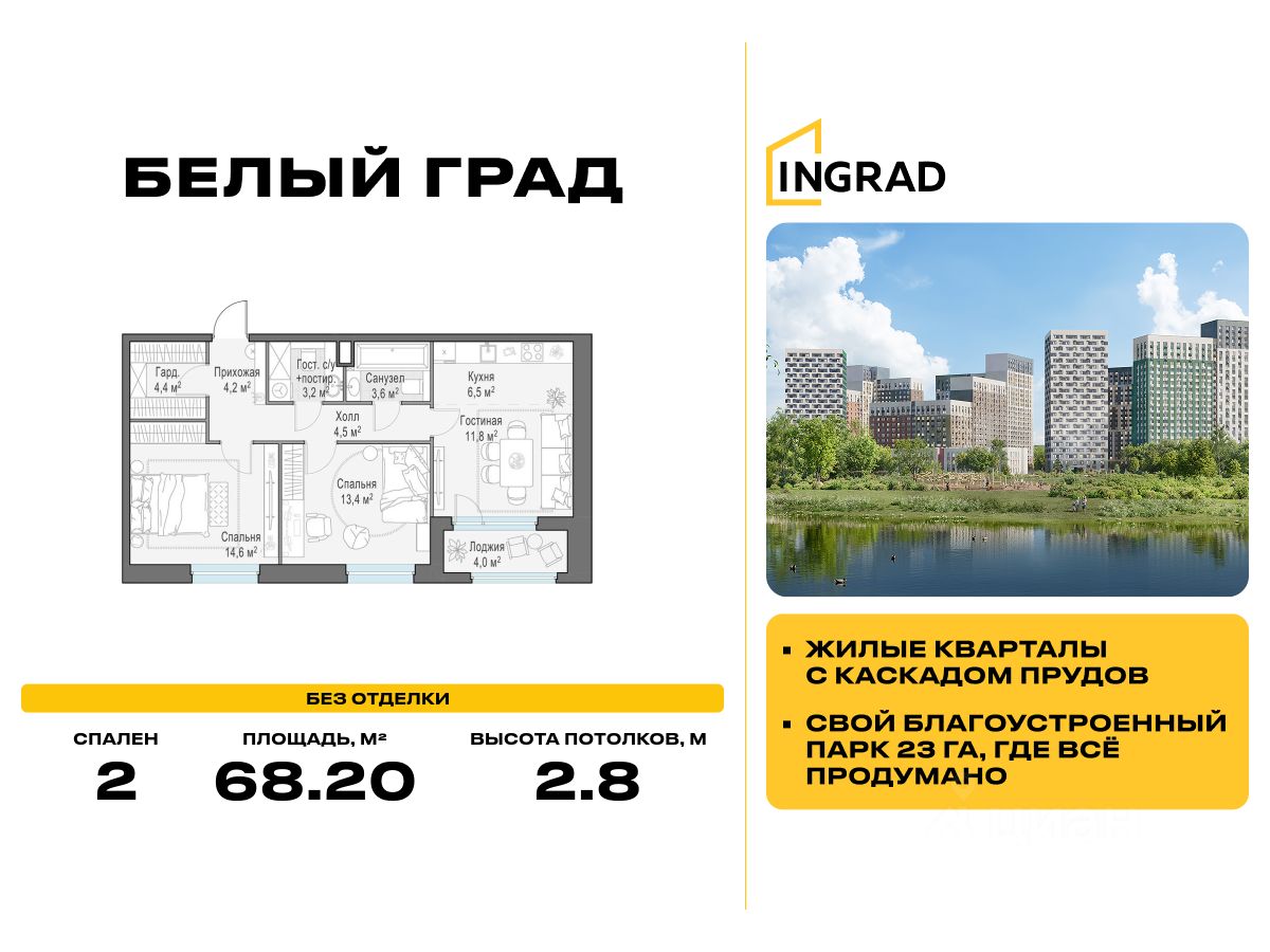 Прямая продажа от девелопера. В жилом квартале комфорт-класса "Белый Град" (девелопер ingrad) продаётся 2-спальная квартира площадью 68.20 кв.м без отделки. Квартира расположена на 2 этаже 20-этажного дома, корпус 12.1.