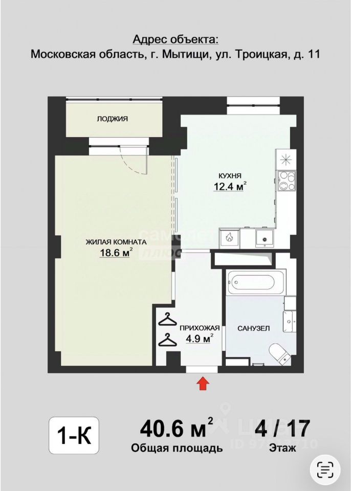 Квартира расположена на 4-м этаже 17-этажного монолитно-кирпичного дома. Общая площадь квартиры составляет 40,6 кв.м., из которых 18,6 м - жилая площадь, а 12,4 м - кухня. С мебелью и техникой - формат: "Заходи и живи"