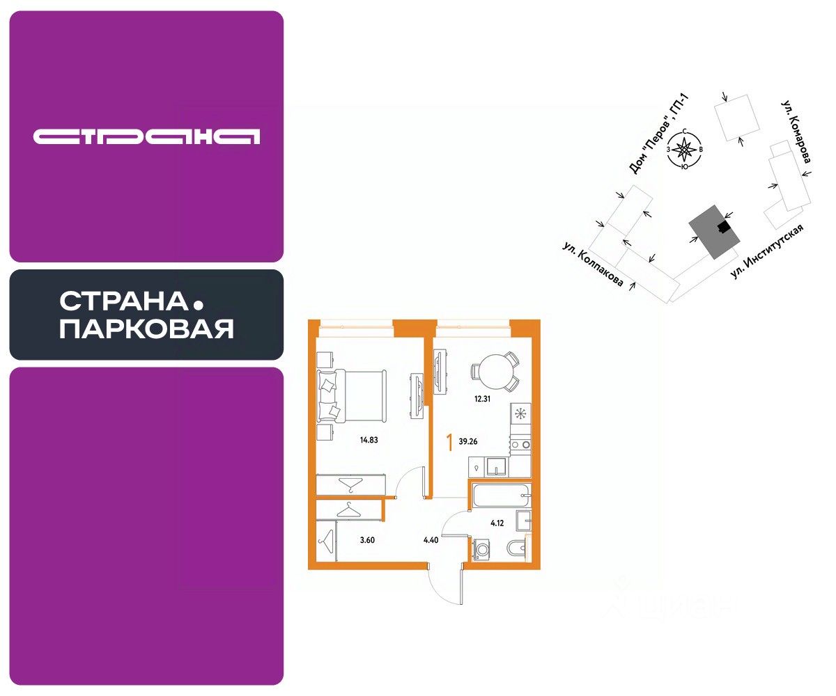 Продается 1комнатная квартира на 7 этаже от застройщика Страна Девелопмент. Площадь квартиры 39.26 кв. м.