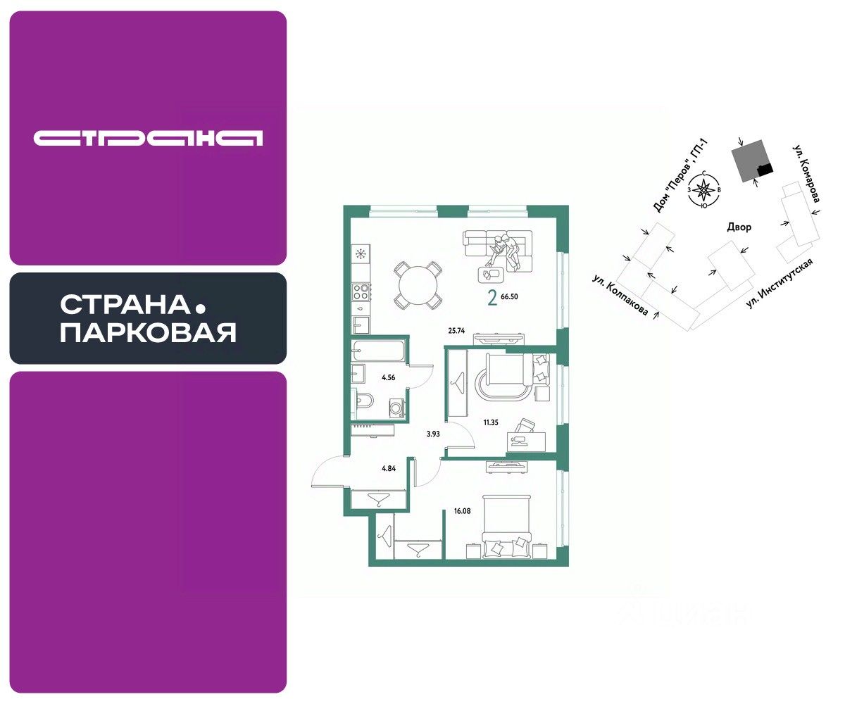 Продается 2комнатная квартира на 17 этаже от застройщика Страна Девелопмент. Площадь квартиры 66.5 кв. м.
