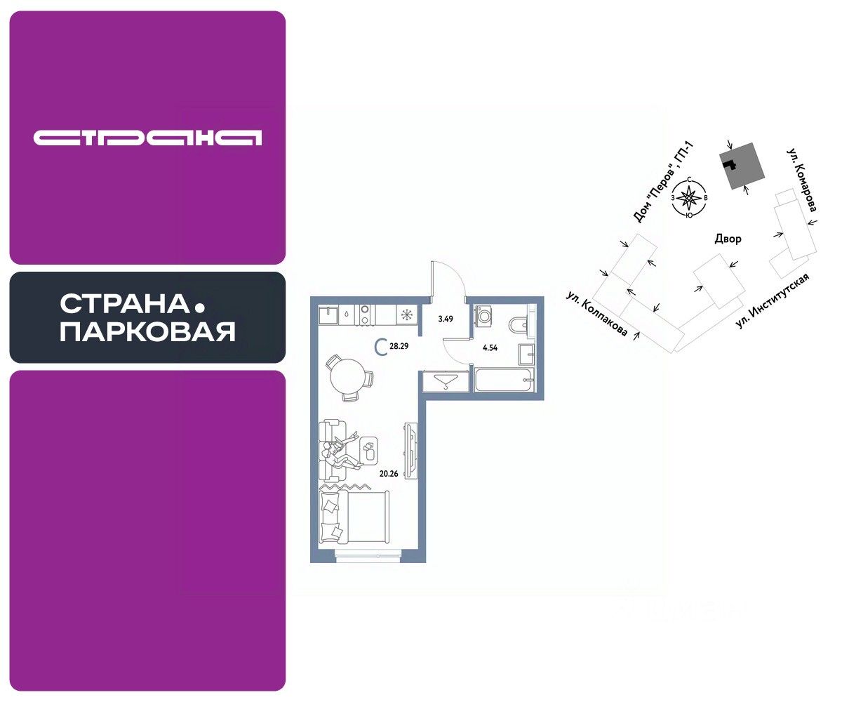 Продается 1комнатная квартира на 20 этаже от застройщика Страна Девелопмент. Площадь квартиры 28.29 кв. м.