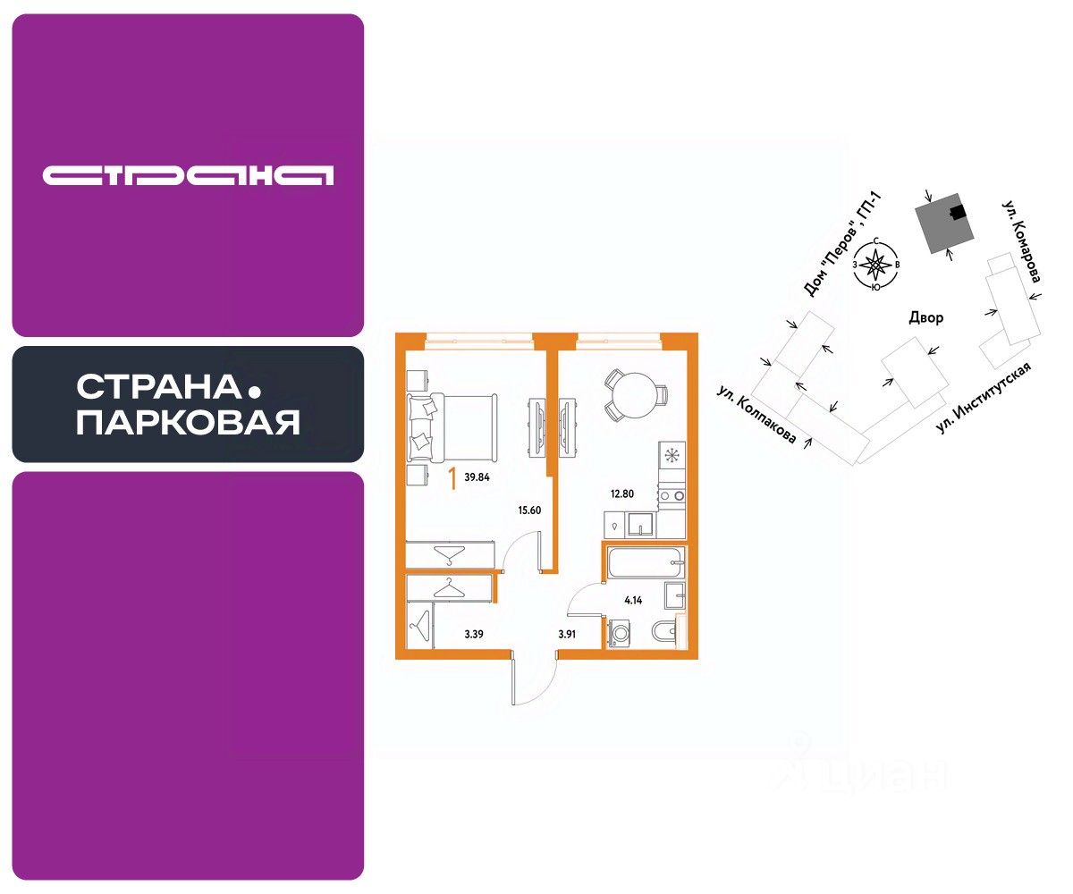 Продается 1комнатная квартира на 21 этаже от застройщика Страна Девелопмент. Площадь квартиры 39.84 кв. м.