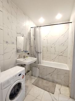Санузел выполнен в качественной керамической плитке. Установлена стиральная машина. Вся сантехника и электрика заменены, не от застройщика!