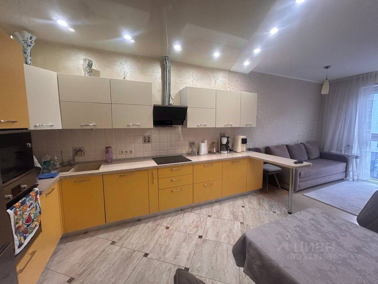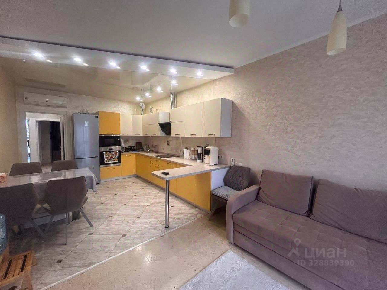 Просторная кухня - гостиная оборудована современной техникой фирмы Bosch, установлен кондиционер, идеально подходит для уютных семейных ужинов.
