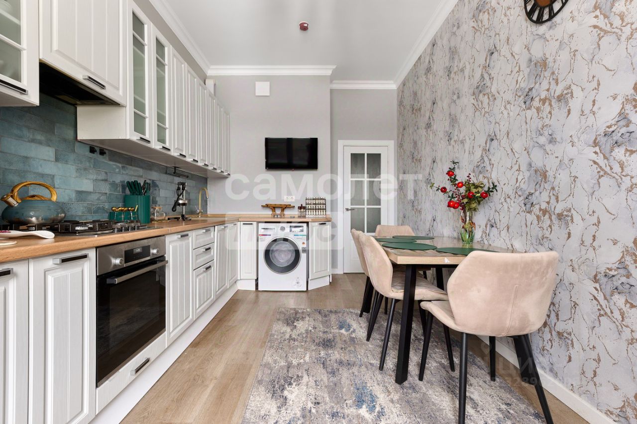 Просторная кухня оснащена всей необходимой техникой (газовая плита, вытяжка, посудомоечная машина, холодильник). Это идеальное место для семейных ужинов и приёма гостей.