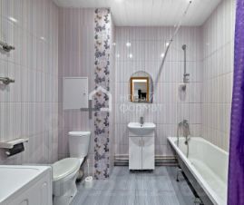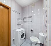 Санузел просторный, выполнен в светлой гамме с использованием износостойкой плитки, что обеспечивает безупречную гигиену и лёгкость в уходе.
