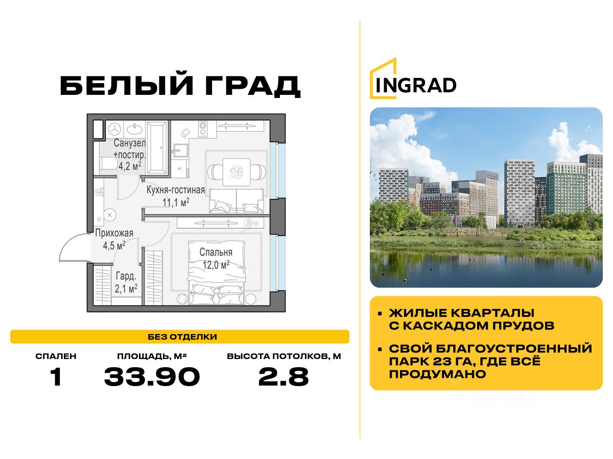 Прямая продажа от девелопера. В жилом квартале комфорт-класса "Белый Град" (девелопер ingrad) продаётся 1-спальная квартира площадью 33.90 кв.м без отделки. Квартира расположена на 12 этаже 20-этажного дома, корпус 12.2.