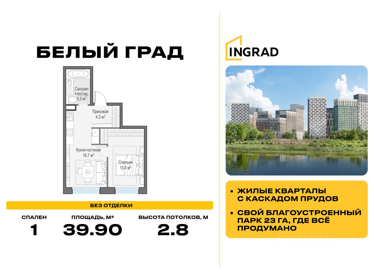 Прямая продажа от девелопера. В жилом квартале комфорт-класса "Белый Град" (девелопер ingrad) продаётся 1-спальная квартира площадью 39.90 кв.м без отделки. Квартира расположена на 12 этаже 23-этажного дома, корпус 11.3.