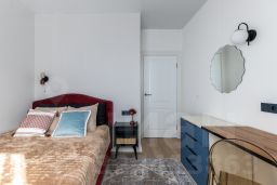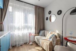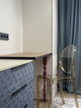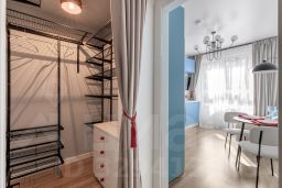 В данной планировке расположилась полноценная двухспальная кровать с подъемным механизмом от Асконы, места для хранения с качественными фасадами из МДФ с не банальной фрезировкой, вместительная гардеробная и функциональная кухня-гостиная с многочисленными розеточками и дополнительным раскладывающимся спальным местом от Диванру.