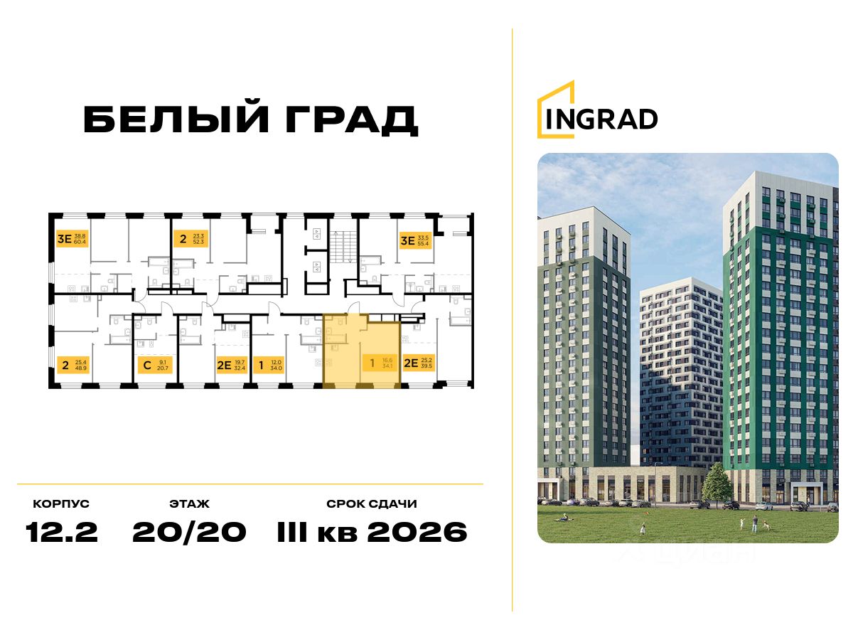 Прямая продажа от девелопера. В жилом квартале комфорт-класса "Белый Град" (девелопер ingrad) продаётся 1-спальная квартира площадью 34.10 кв.м без отделки. Квартира расположена на 20 этаже 20-этажного дома, корпус 12.2.
