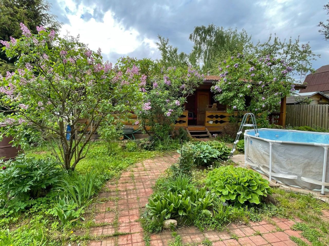 На ухоженном участке растут взрослые деревья, цветы, малина, клубника, смородина. Это уголок, где можно забыть о суете и насладиться тишиной и гармонией.
