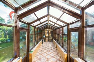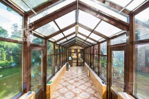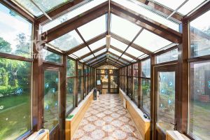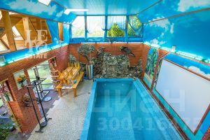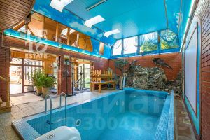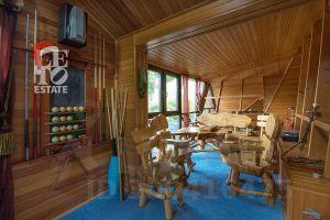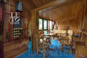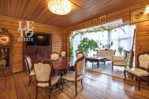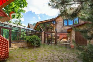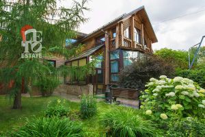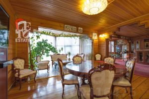 Дом построен из клееного бруса, полностью отделан, меблирован и готов к проживанию. На участке выполнен ландшафтный дизайн, высажены крупные деревья, есть фруктовый сад. Также на участке построен отдельно стоящий СПА-комплекс, с сауной, бассейном, бильярдной. С основным домом он соединен стеклянным отапливаемым коридором.