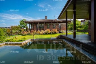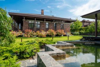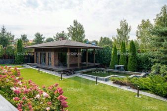 На придомовом участке - озеро с водопадом, беседка с камином, дорожки,