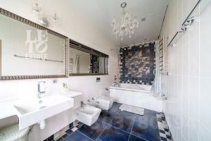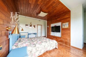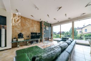 Внутренняя отделка соответствует общей стилистике дома. В доме выполнен дизайнерский ремонт в современном стиле. Пол первого этажа полностью отделан плиткой и оснащен функцией обогрева. В комнатах второго этажа напольным покрытием служит натуральное дерево. В доме предусмотрено место для помпового лифта. Центром притяжения является межэтажная лестница со стеклянными ступенями и просторная кухня-гостиная, выдержанная в единой цветовой и стилистической гамме. Благодаря панорамному остеклению в доме всегда много света и воздуха.
