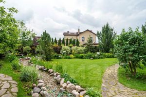 На прекрасном ровном участке площадью 21,44 сотки выполнен ландшафтный дизайн. Помимо основного дома здесь также расположен гараж с цокольным этажом под хранение техники и с  полноценной квартирой для персонала на втором этаже, открытая терраса, спортивная и детские площадки. Вокруг дома установлена надежная дренажная система. Многолетние хвойные и лиственные деревья гармонично вписываются в общий облик этого современного и стильного дома.