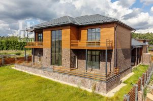 Фасад облицован камнем малахит, а фасадные планкены выполнены из лиственницы и покрыты масло-воском Pinotex.