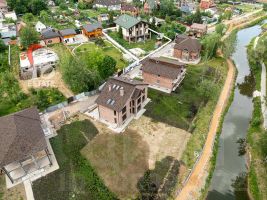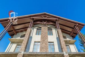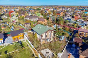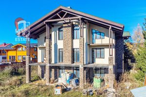 Этот трёхэтажный дом площадью 690 кв.м., выполненный в стиле шале, построен на участке площадью 16,8 соток с естественным уклоном. Стены дома выполнены из высококачественных блоков Porotherm с толщиной 510 мм и утеплением в 120 мм. Кровля утеплена (толщина утеплителя — 200 мм) и покрыта композитной черепицей, обшитой лиственницей, что обеспечивает надежность и долговечность конструкции. В доме выполнена разводка электричества, газ заведен в дом, получены технические условия на 15 кВт электроэнергии, септик и скважина требуют завершения работ. На участке уже залит фундамент под отдельно стоящий гараж с подведенными коммуникациями.