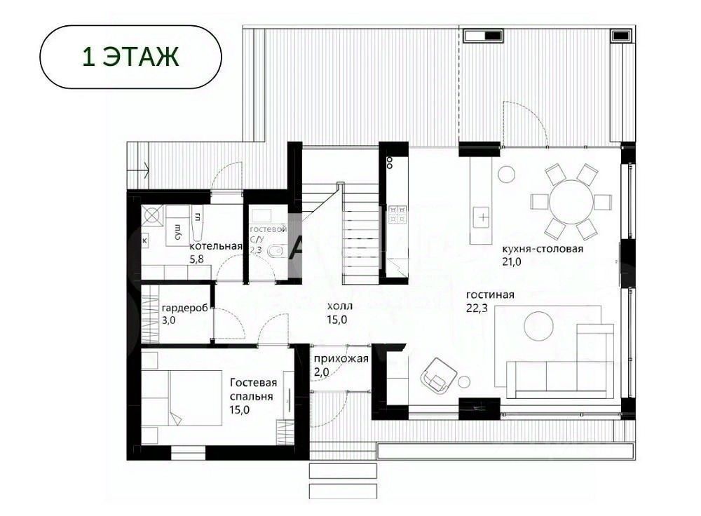 1 этаж: кухня-столовая с совмещенной гостиной, гостевая спальня, гардероб, котельная, с/у;