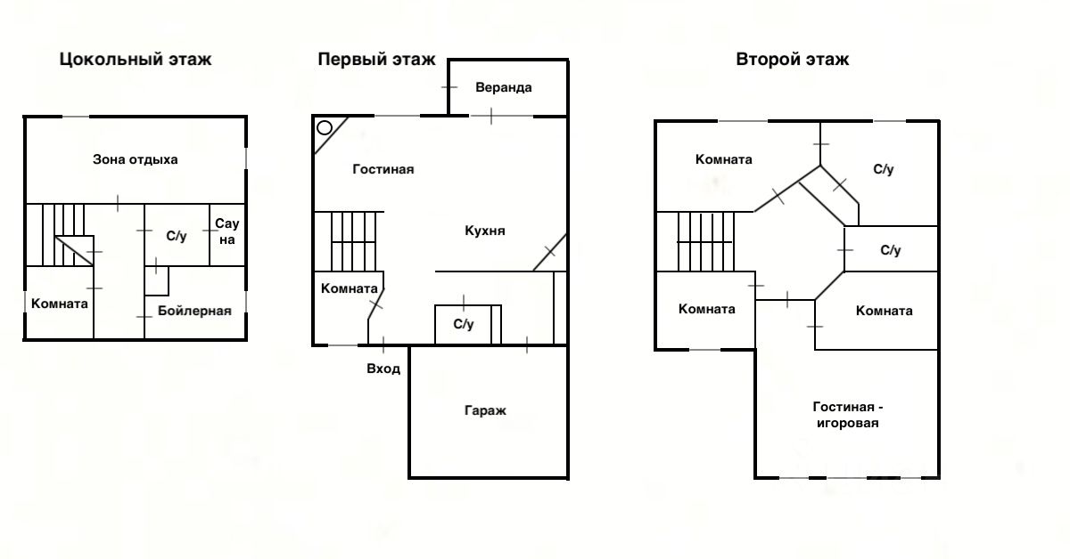 Цокольный этаж: бойлерная, санузел (душ) с финской сауной, гостевая спальня, зона отдыха 35.2 м2 с шумоизоляцией по всему периметру помещения, где возможно разместить кинотеатр, с выводом воды под организацию кухни/бара.