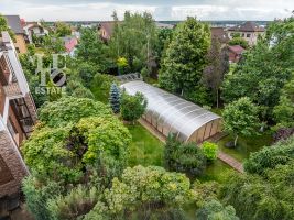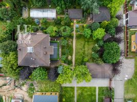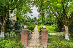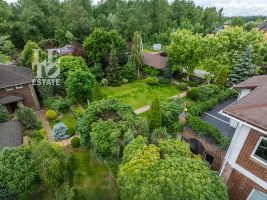 На участке оформлен красивый сад с декоративными растениями, крупномерами. Дорожки вымощены, сделан дренаж, освещение, установлены автоматические ворота. Для автомобилей предусмотрена площадка, гараж и навес.