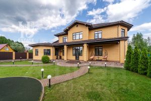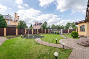 Участок просторный, застелен газоном, выполнены дренажные работы, смонтировано уличное освещение и система автополива. Продуманная въездная группа, обеспечивающая комфортную парковку нескольких автомобилей. По периметру участка выложена беговая дорожка, установлена детская площадка и беседка.