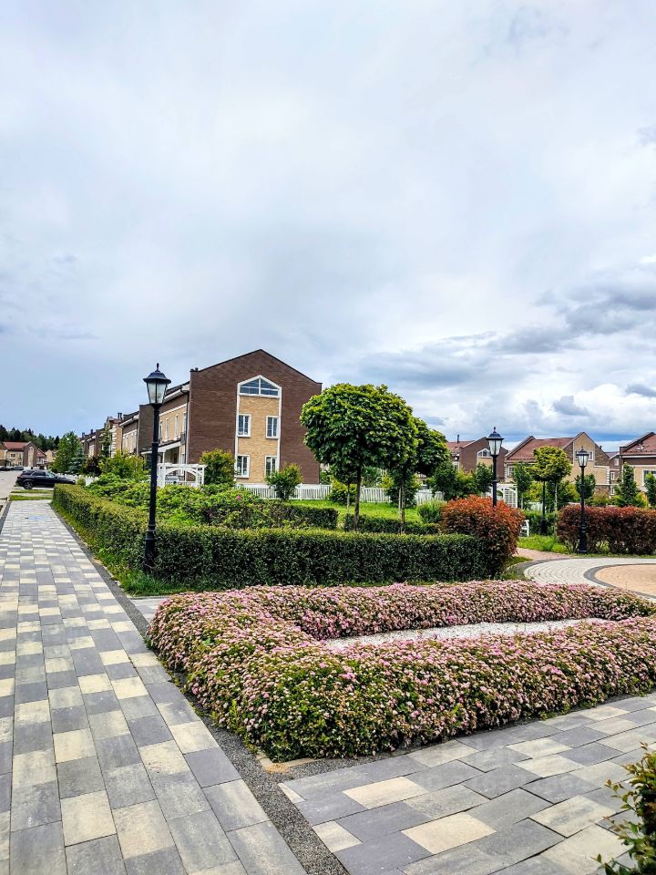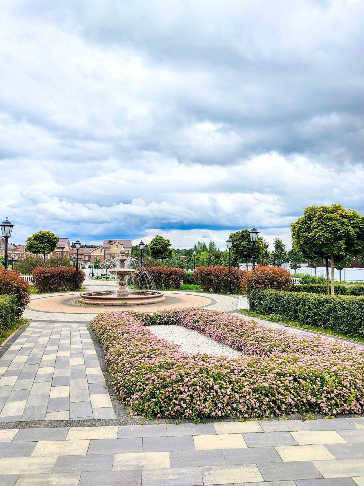 - ухоженная территория, парк с фонтаном, детские и спортивные площадки, обустроенные дороги;