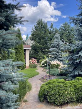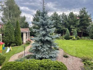 Вдоль забора растут лесные деревья, которые создают уют и отгораживают участок от остального мира.