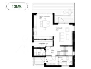 1 этаж: кухня-столовая с совмещенной гостиной, кладовая, тех. помещение и с/у;