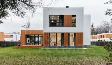 - Материалы: фасады отделаны эластичной штукатуркой и натуральным деревом. Стены из газосиликатного блока с утеплением минеральной плитой 100 мм, надежные железобетонные перекрытия, плоская гибкая кровля, двойные стеклопакеты.