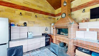 140 м, 1 этаж с 2 комнатами, санузлом, душевой, парилкой и утепленной мангальной зоной с камином.