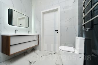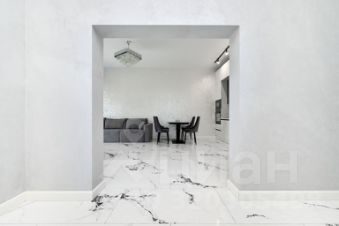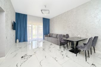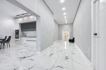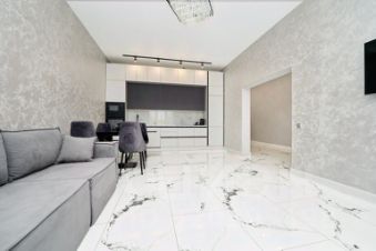 В коридоре и кухне-гостиной водяной теплый пол с керамогранитной плиткой 60/120. В комнатах высокопрочный ламинат 34 класса.