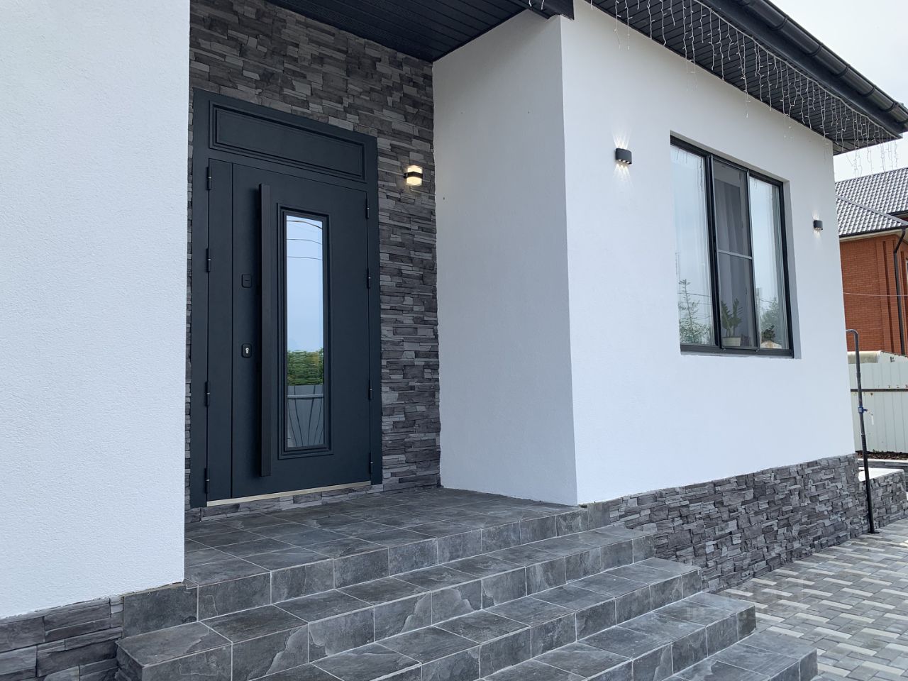 Отделка фасада штукатурка с выделенными элементами из клинкерного кирпича.
