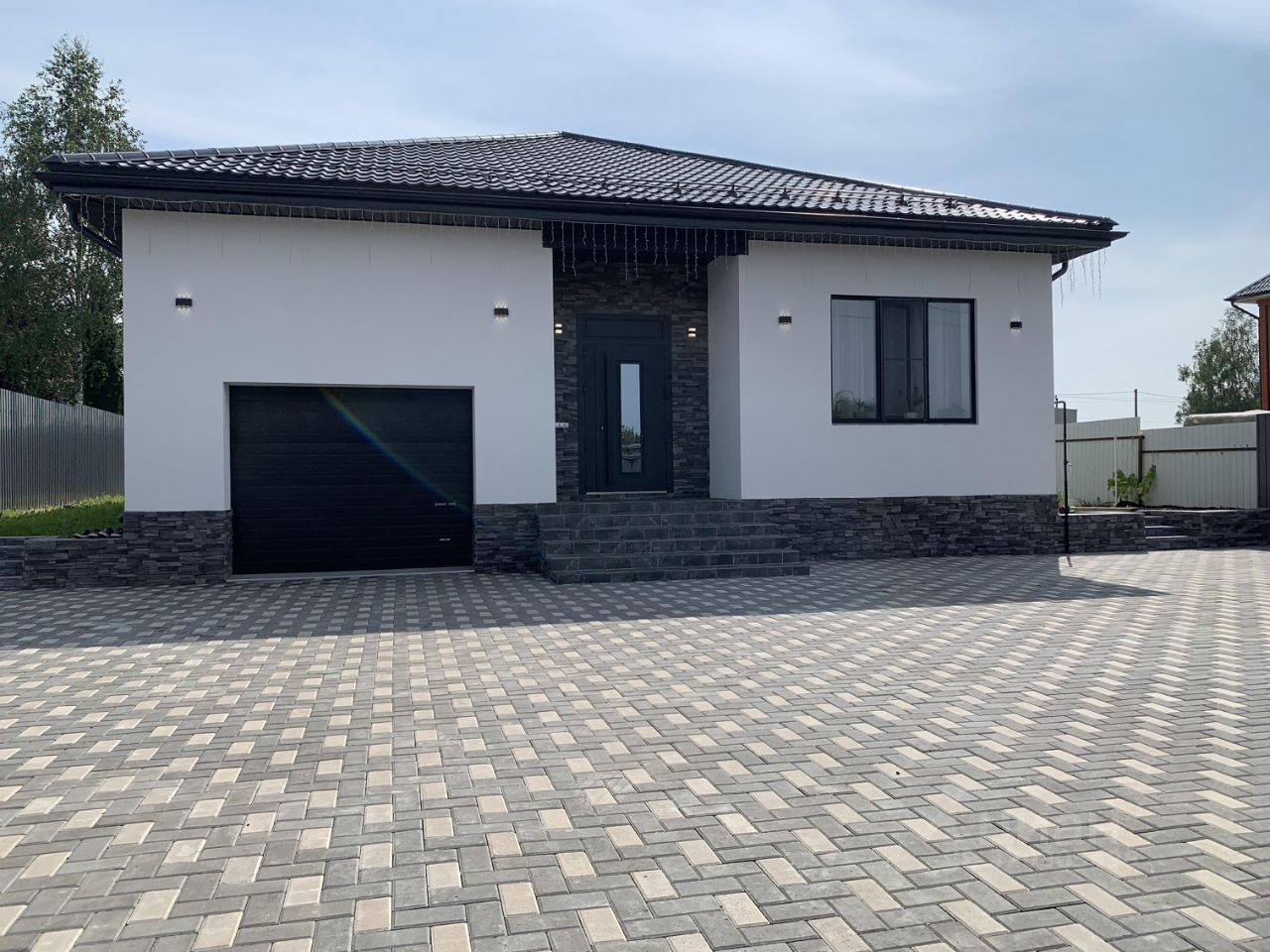 Придомовая территория залита бетонном, уложена брусчатка.