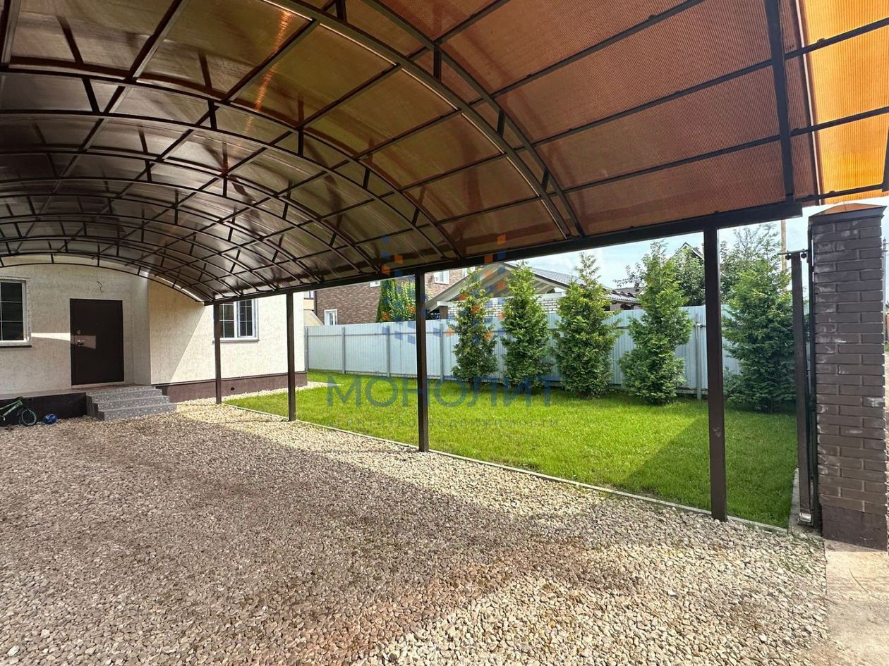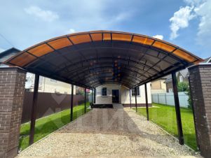 На ровном участке прямоугольной формы расположен навес на 2 а\м, засеян газон, высажены туи.