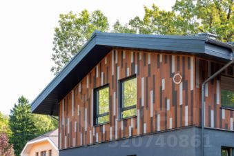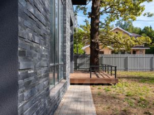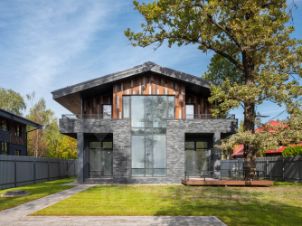 Внешняя отделка стен натуральным чёрным сланцем, дисперсионной штукатуркой и элементами лиственной древесины;