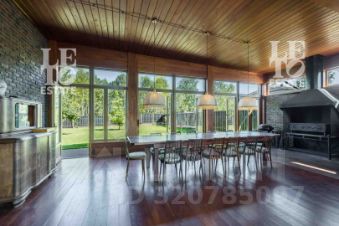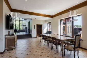 Из кухни столовой есть выход на большую крытую веранду, пристроенную к дому. Веранда полностью выполнена из лиственницы и имеет двухстороннее панорамное остекление. Веранда зрительно разбита на зону отдыха с камином мангалом и спортивную: тренажеры, настольный теннис.