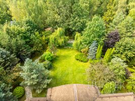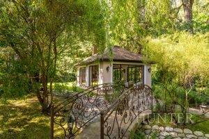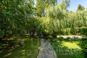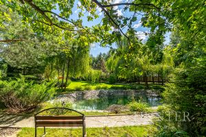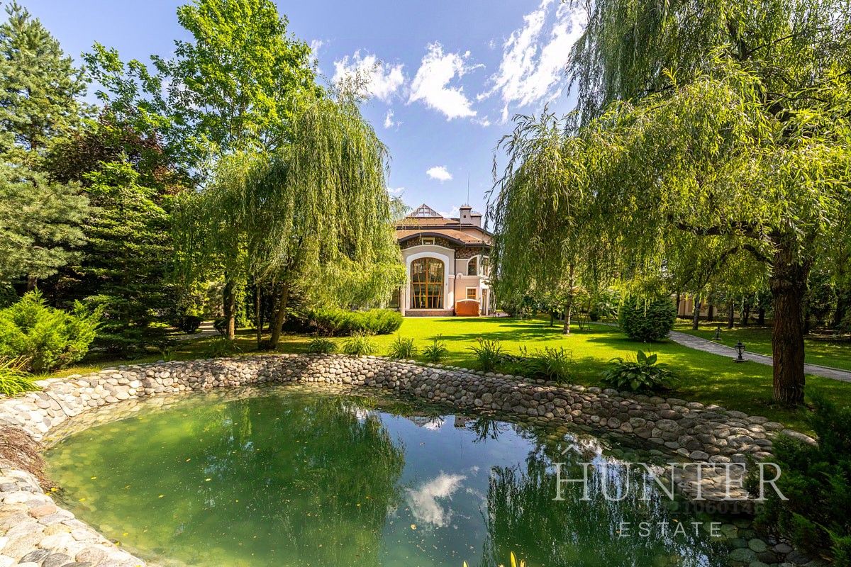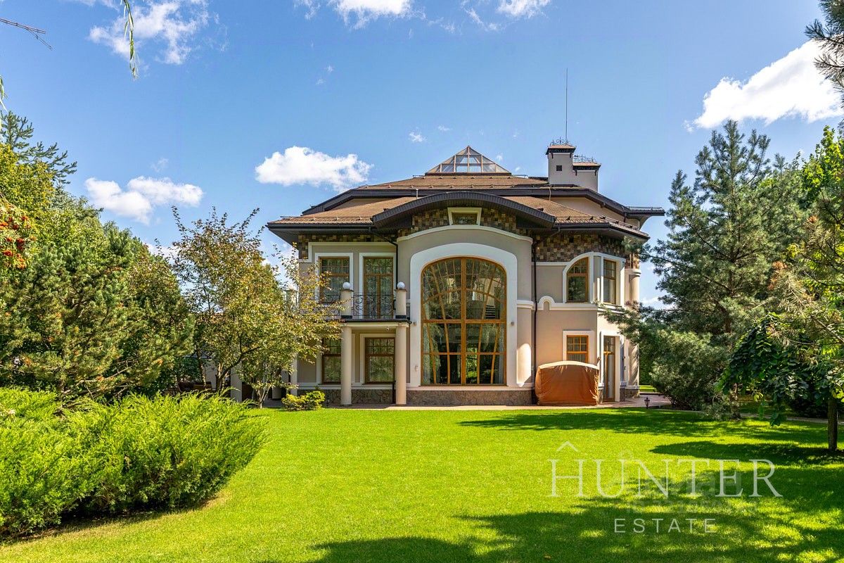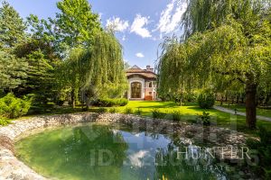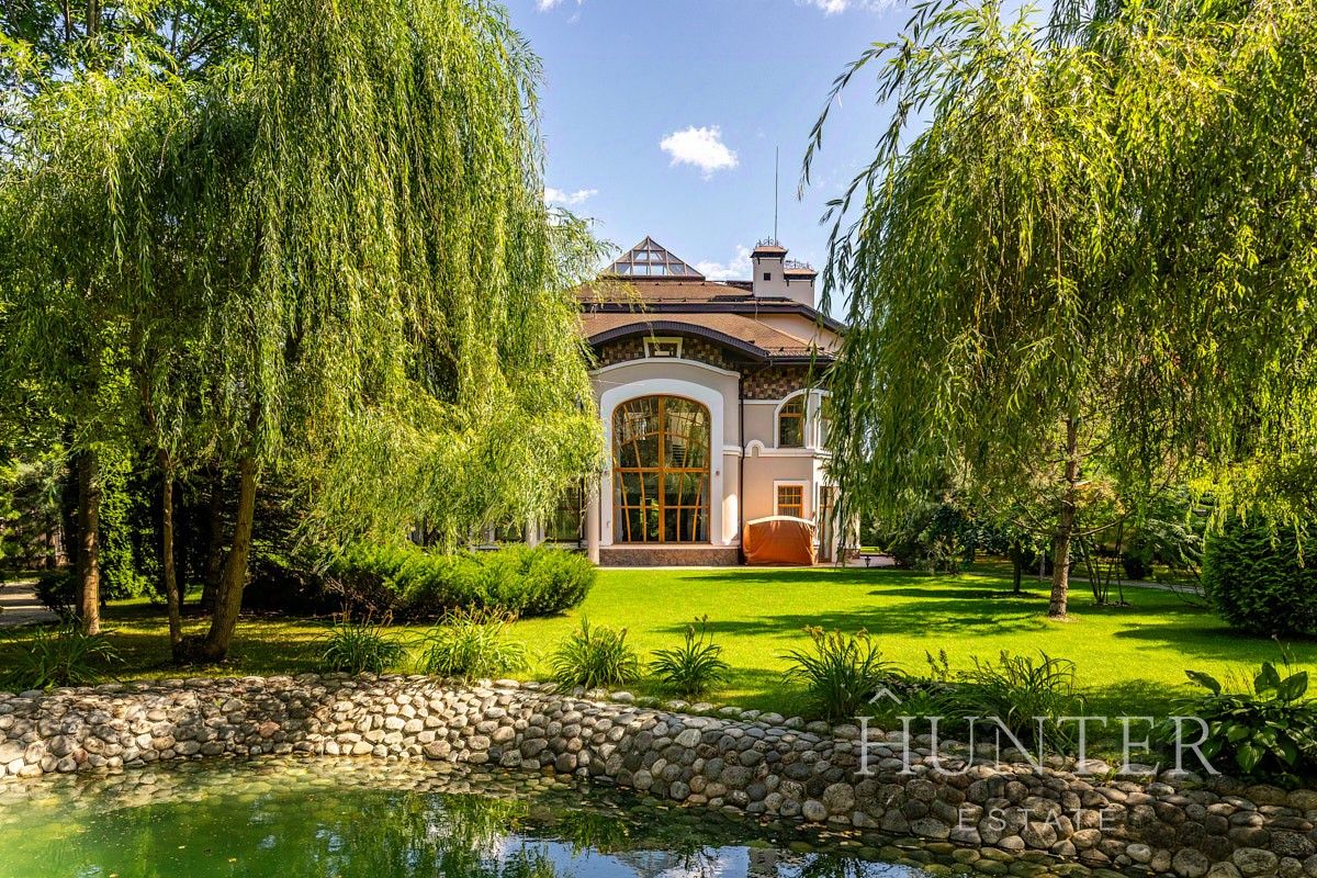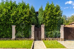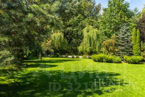 На участке выполнен ландшафтный дизайн, посажены: декоративные растения и кустарники, 5 видов сосен, кедр, пихты. Тротуары вымощены камнем и гранитом, установлено ландшафтное освещение. В центре участка находится декоративный пруд голубиной 3 метра с ручьем и водопадом. На участке помимо основного дома построены беседка с печью для приготовления блюд, дом для персонала, и гараж для мототехники.
