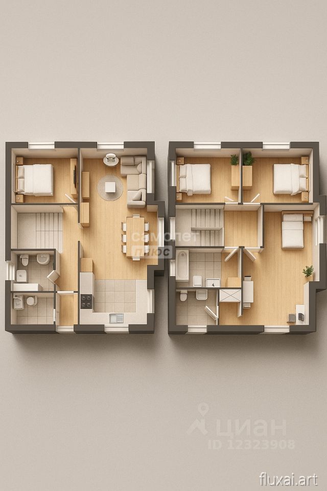 2 этаж - 3 спальные комнаты (одна мастер спальня со своим санузлом, гардеробной) и одна душевая комната с санузлом;