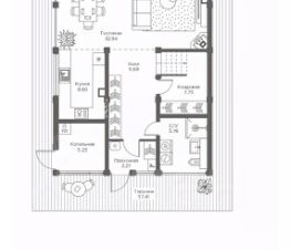 Первый этаж: прихожая, холл, кухня, гостиная-столовая с выходом на террасу, кладовая, санузел, котельная.
