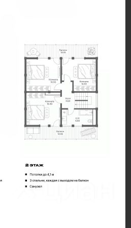 Второй этаж: спальня с балконом, детская комната с балконом, гостевая комната с балконом, санузел с балконом.