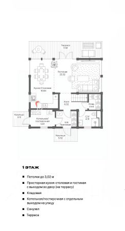 Первый этаж: прихожая, холл, кухня-столовая и гостиная с выходом на террасу, кладовая, санузел, котельная.