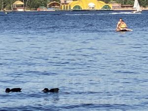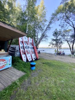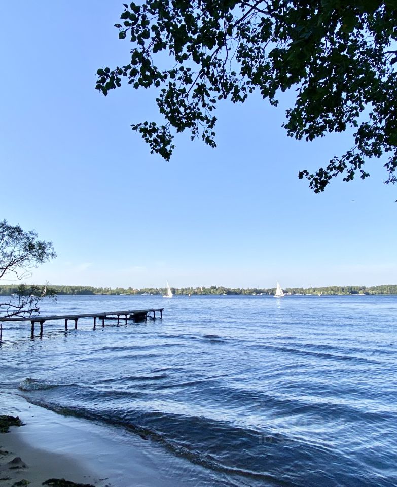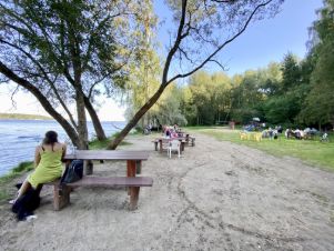 Песчаный пляж с пологим входом и прокатом инвентаря для водных видов спорта, находится в 10 минутах ходьбы.