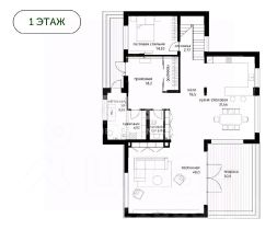 1 этаж: кухня-столовая с совмещенной гостиной, гостевая спальня, прачечная, с/у, терраса;